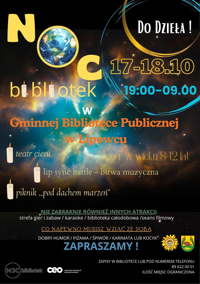 Nasza biblioteka po raz kolejny nie będzie spać ! Przed nami wyjątkowa nic pełna książek i inspiracji. Tegoroczne hasło to " DO DZIEŁA !" - i my też działamy! Dołączcie do nas i wspólnie przeżyjmy Noc Bibliotek ![]()