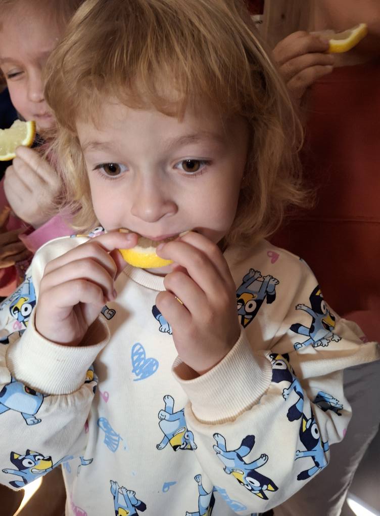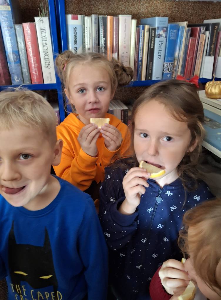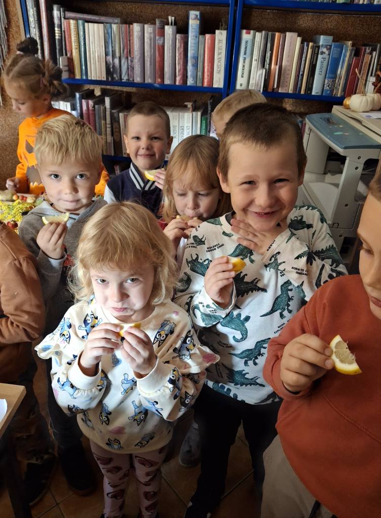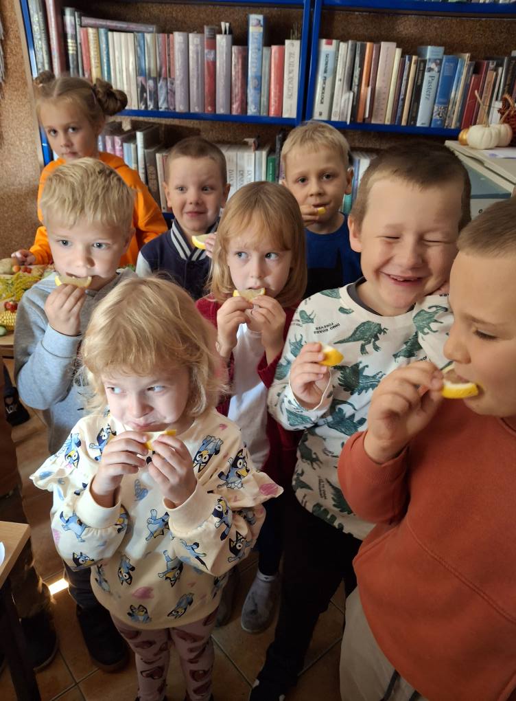Nie zabrakło również dobrej zabawy! Zorganizowaliśmy wesoły konkurs z cytryną – każde dziecko otrzymało kawałek cytryny, a zadaniem było zjeść ją bez skrzywienia się. Wszystkie dzieci poradziły sobie doskonale – nikt się nie „skwasił”, a na twarzach królował uśmiech