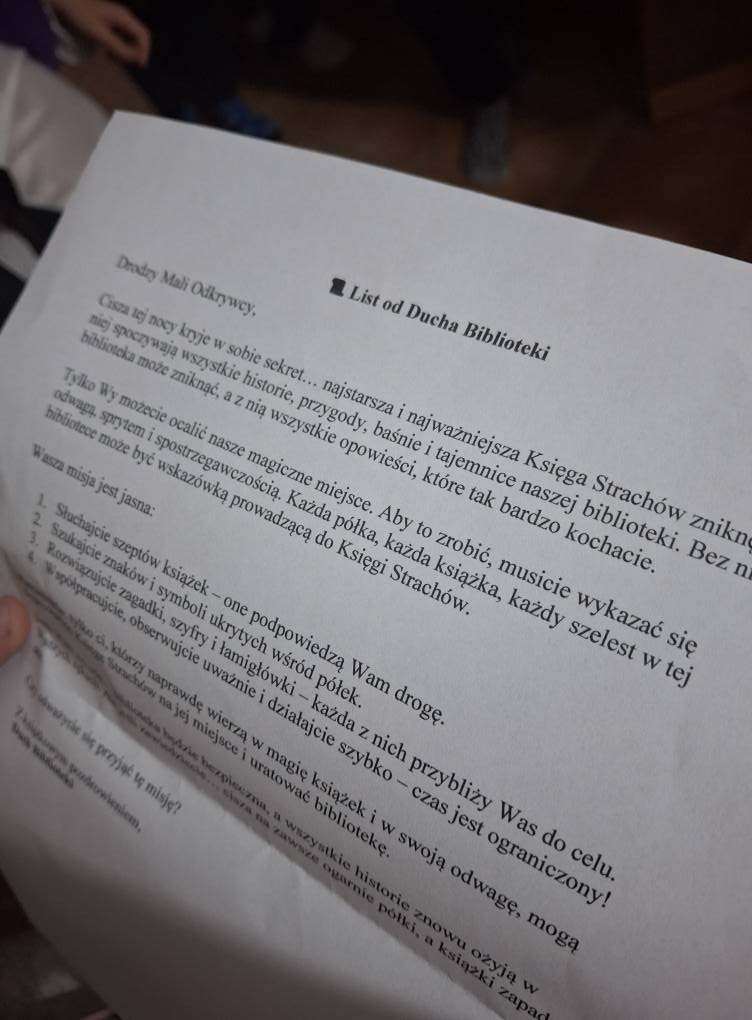 Dzieci w wieku 8–12 lat stały się bohaterami niezwykłej historii. W bibliotecznym półmroku pojawił się list od ducha, który powierzył im wyjątkową misję – odnaleźć zaginioną księgę. Tropiąc wskazówki, rozwiązując zagadki i współpracując jak prawdziwy zespół, nie tylko uratowały magiczną księgę, bez której biblioteka by nie istniała… ale też odnalazły skarb, który wzbudził prawdziwy entuzjazm i radość!