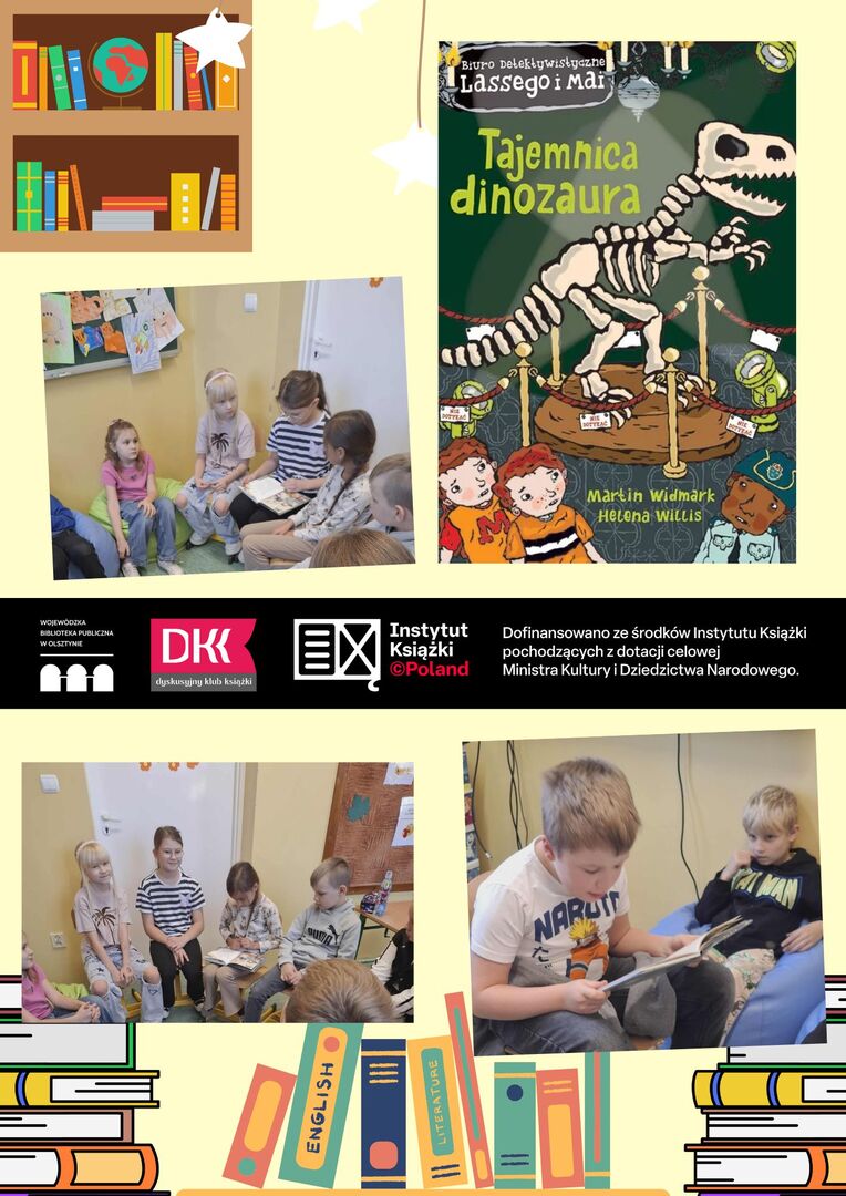 Podczas dzisiejszego spotkania Dyskusyjnego Klubu Książki dla dzieci rozmawialiśmy o książce „Tajemnica dinozaura” z serii Biuro Detektywistyczne Lassego i Mai. Uczestnicy chętnie dzielili się swoimi wrażeniami z lektury, omawiali ulubione momenty oraz próbowali samodzielnie rozwiązać zagadkę przed bohaterami. Dzieci zwróciły uwagę na ciekawą fabułę, humor i pomysłowe śledztwo. Na zakończenie spotkania odbyła się krótka zabawa tematyczna związana z dinozaurami.