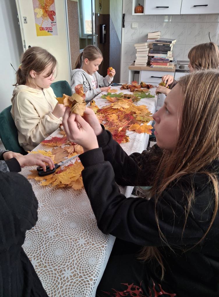 Złote, czerwone i pomarańczowe barwy jesieni wypełniły całą bibliotekę, tworząc ciepłą i radosną atmosferę.
