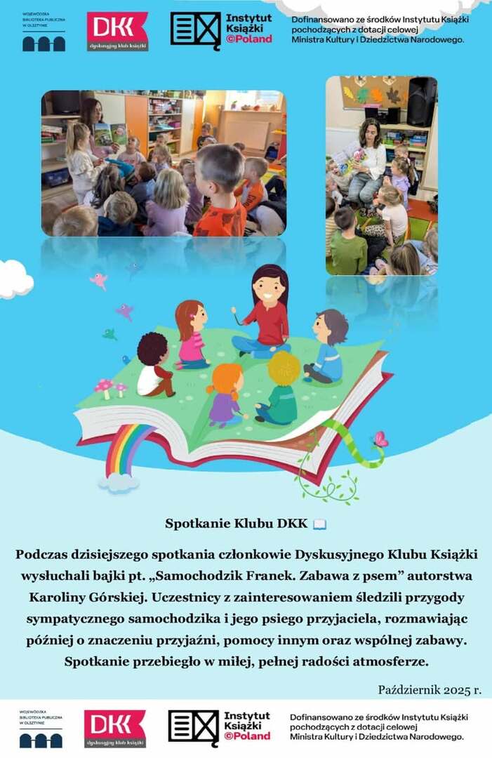 Podczas dzisiejszego spotkania członkowie Dyskusyjnego Klubu Książki wysłuchali bajki pt. „Samochodzik Franek. Zabawa z psem” autorstwa Karoliny Górskiej. Uczestnicy z zainteresowaniem śledzili przygody sympatycznego samochodzika i jego psiego przyjaciela, rozmawiając później o znaczeniu przyjaźni, pomocy innym oraz wspólnej zabawy. Spotkanie przebiegło w miłej, pełnej radości atmosferze.