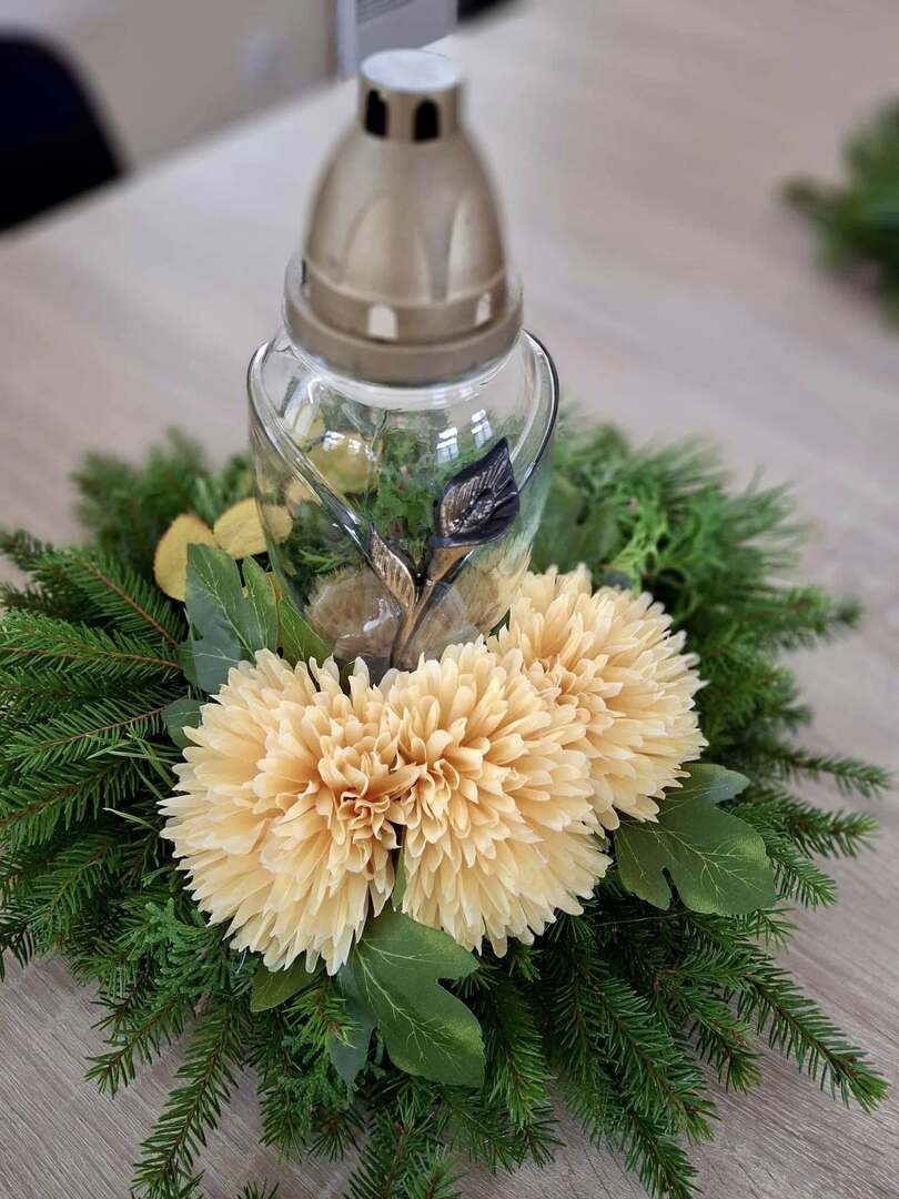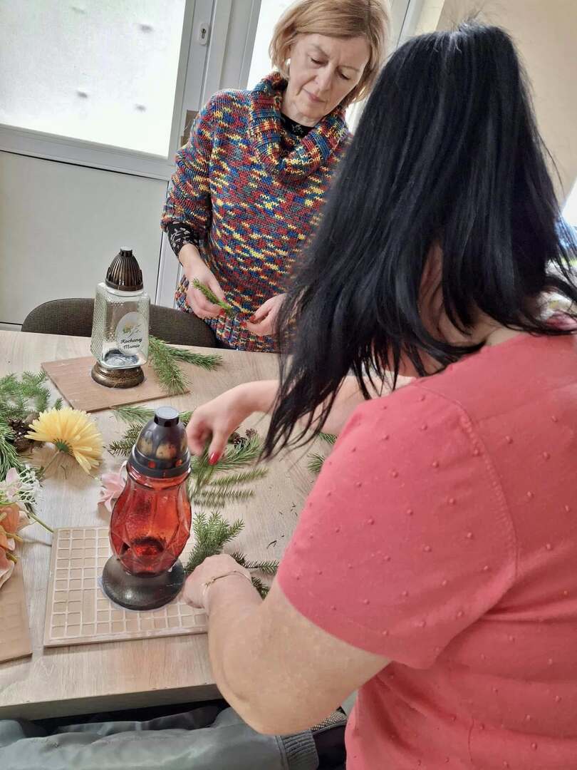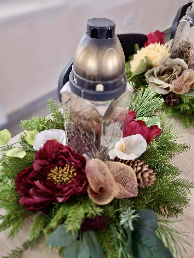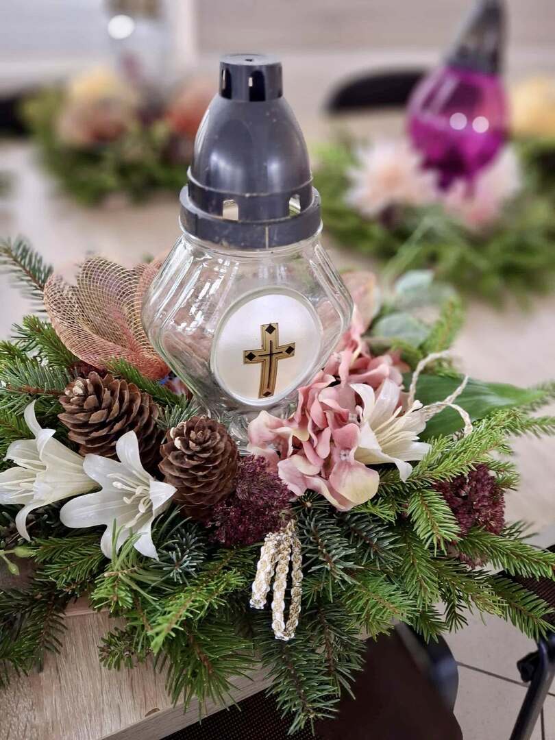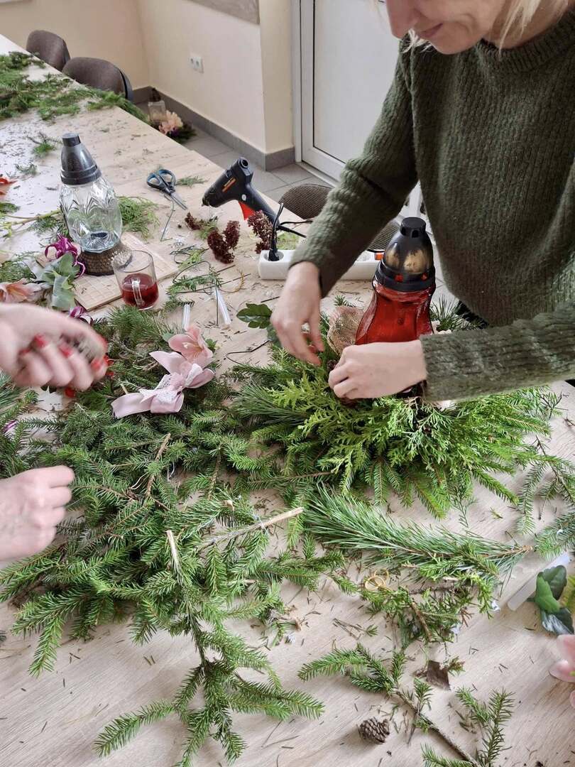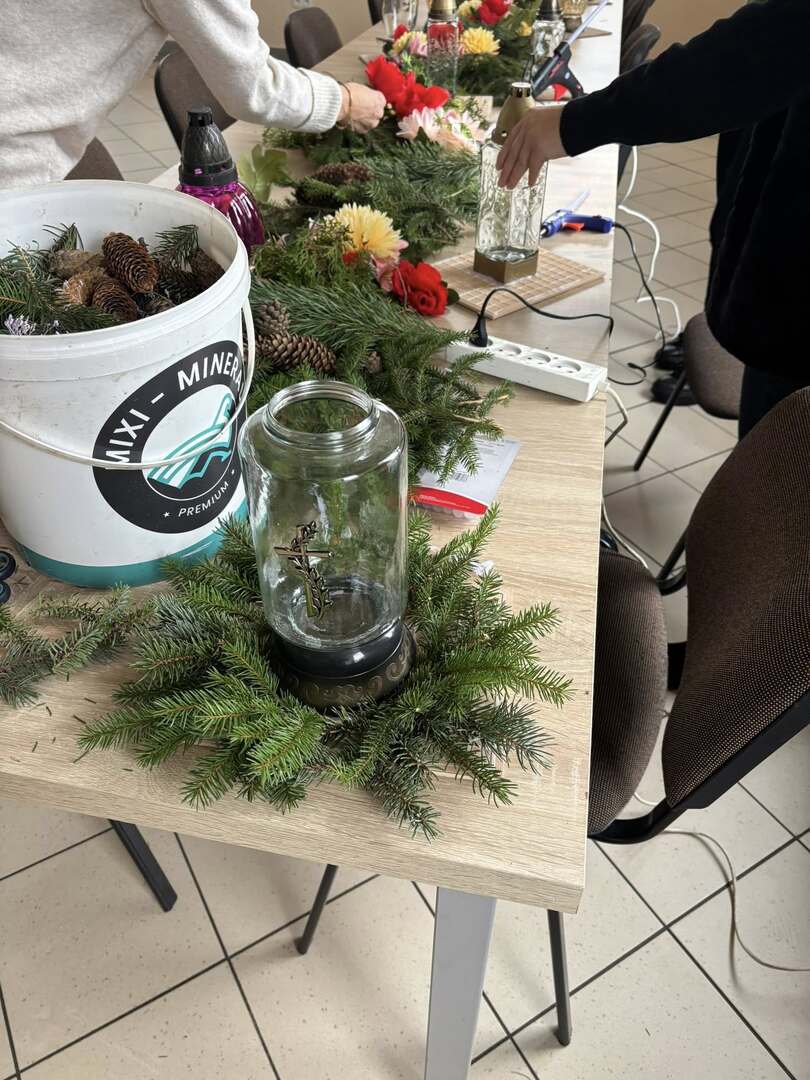 Zajęcia florystyczne miały wyjątkowy, refleksyjny charakter. Uczestnicy tworzyli ekologiczne dekoracje na nagrobki, wykorzystując świerk, tuję i oczyszczone znicze, które otrzymały nowe życie. Podstawy kompozycji powstały ze starych płytek – prostych, a zarazem symbolicznych, bo niosących ideę ponownego wykorzystania. Wspólna praca przy montażu gałązek, kwiatów i wstążek sprzyjała zadumie, rozmowie i cichej pamięci o bliskich. To spotkanie natury, wspomnień i troski o środowisko.