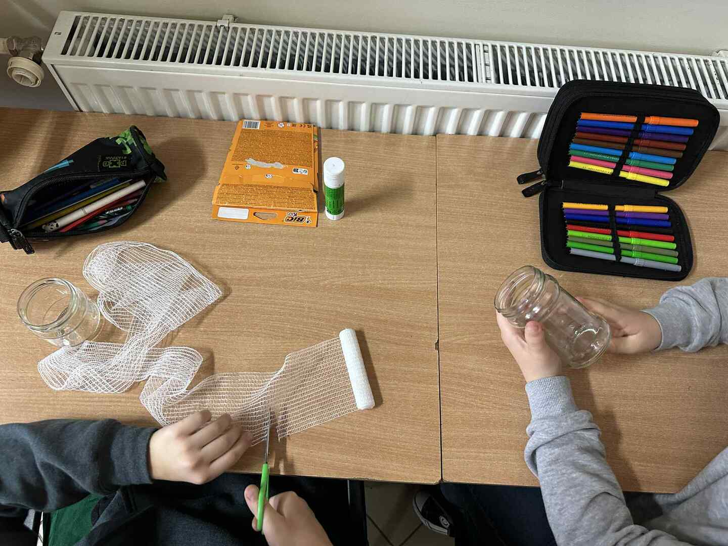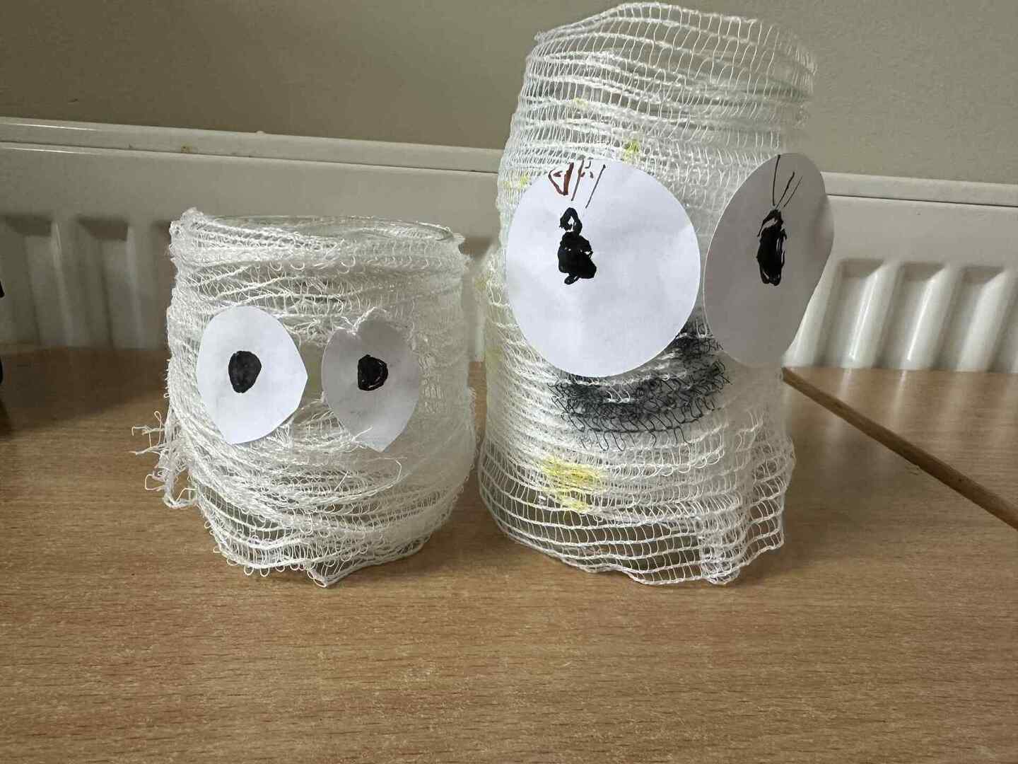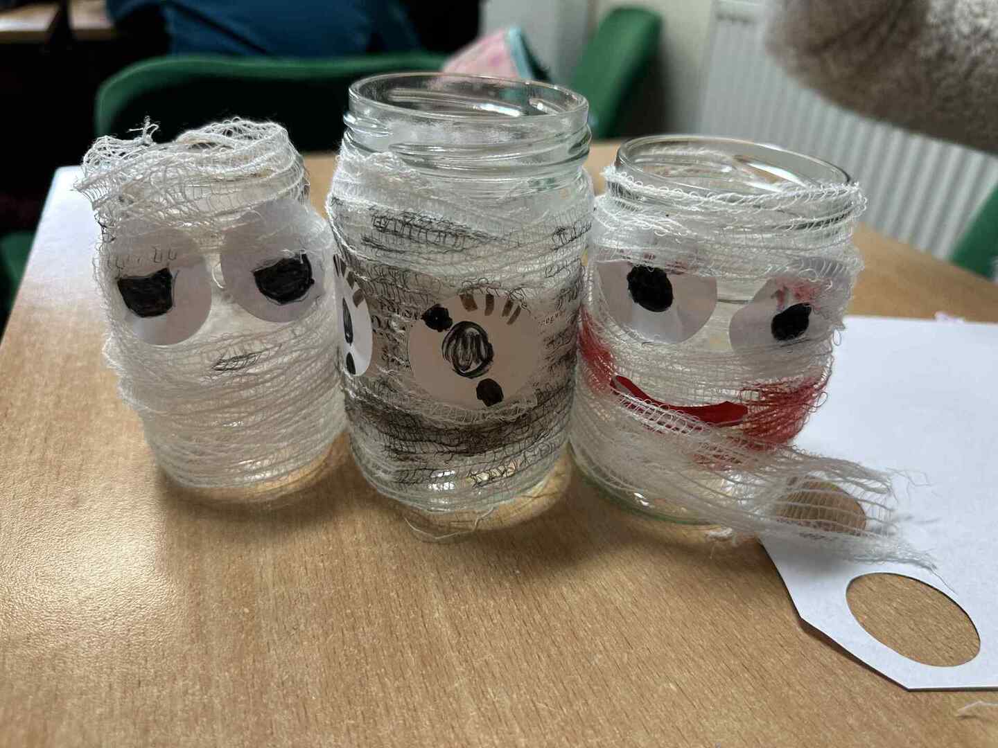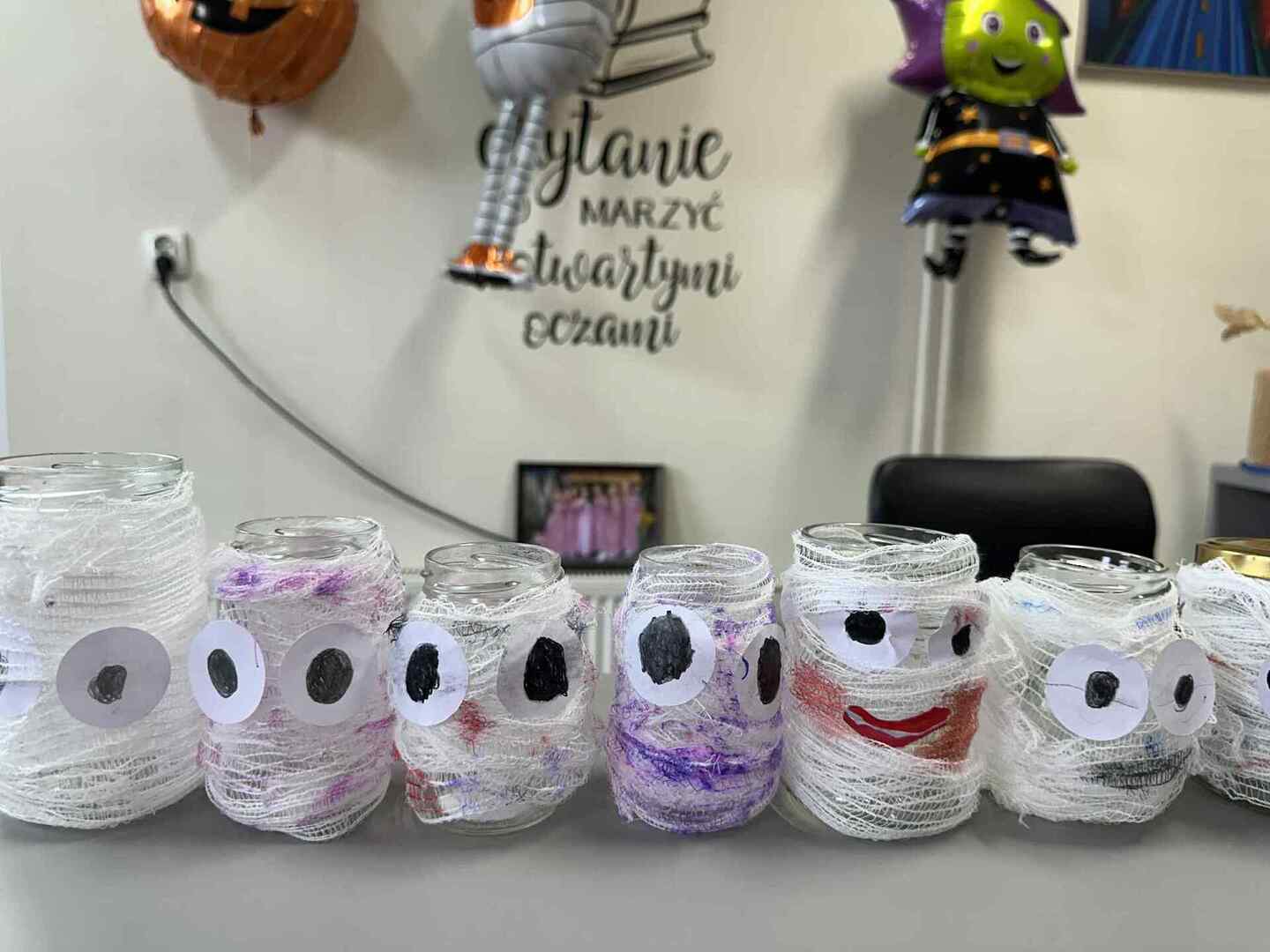 Podczas warsztatów dzieci zamieniły zwykłe słoiki w strasznie sympatyczne mumiowe lampiony 🩻💡 — owijały je bandażami, doklejały oczka i tworzyły jedyne w swoim rodzaju halloweenowe ozdoby!