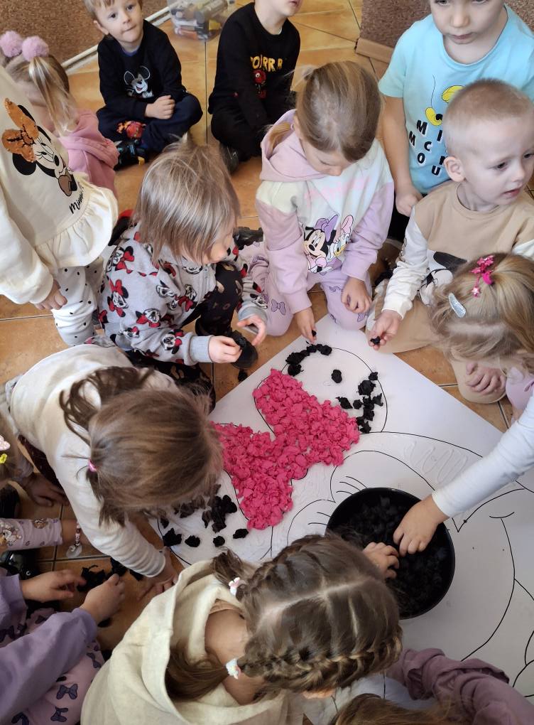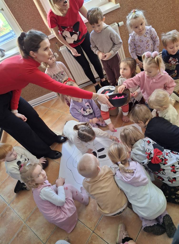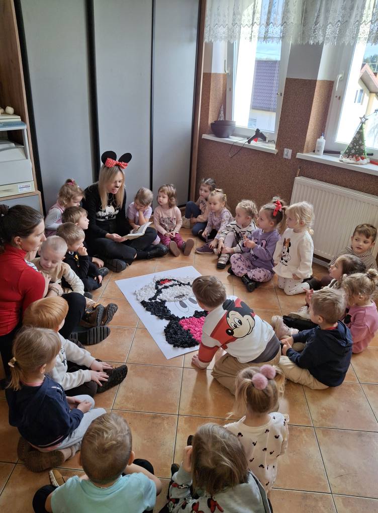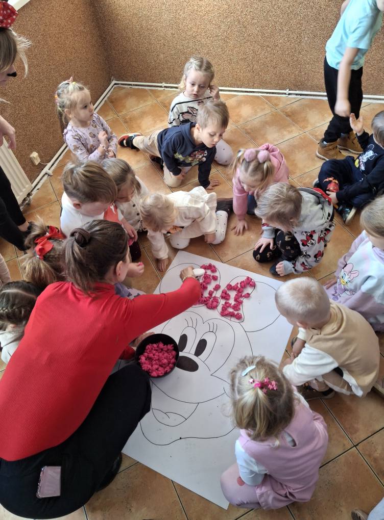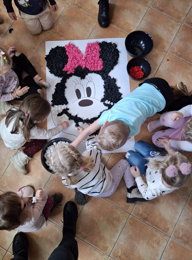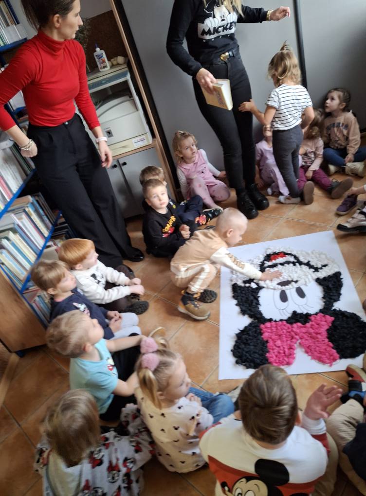 Z tej okazji najmłodsza grupa przedszkolaków z ZSP w Lipowcu, wraz z Panią Agnieszką i Panią Justyną, odwiedziła nas, aby wspólnie wykonać pracę plastyczną – wyklejankę z bibuły przedstawiającą Myszkę Mini.