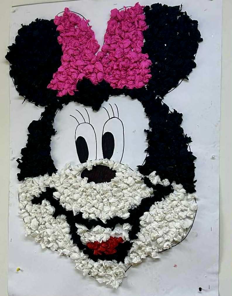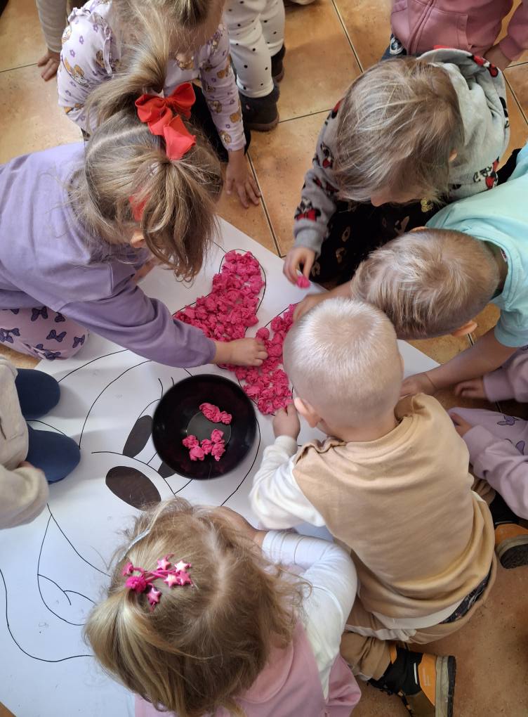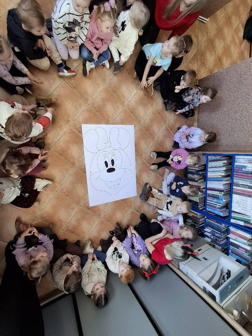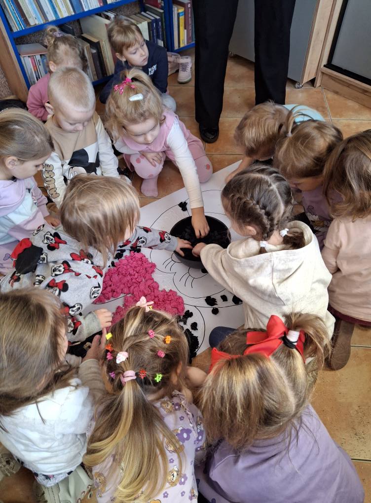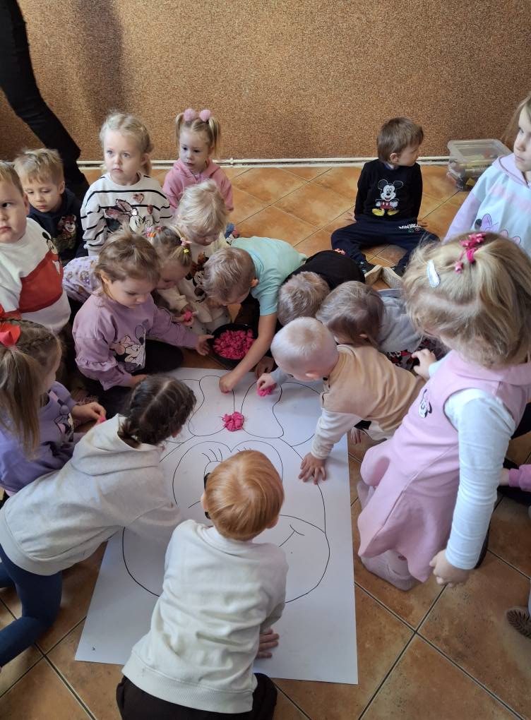 Z tej okazji najmłodsza grupa przedszkolaków z ZSP w Lipowcu, wraz z Panią Agnieszką i Panią Justyną, odwiedziła nas, aby wspólnie wykonać pracę plastyczną – wyklejankę z bibuły przedstawiającą Myszkę Mini.