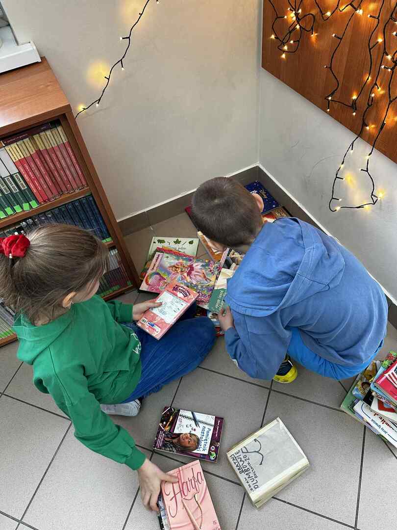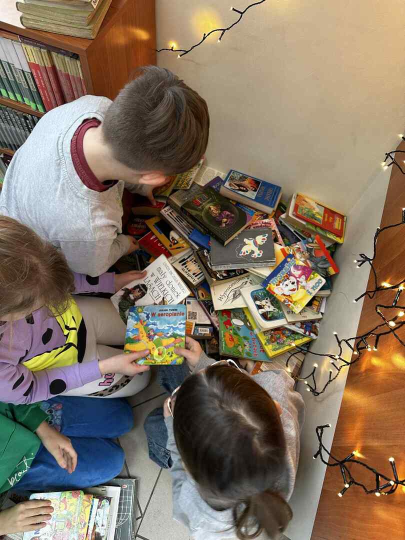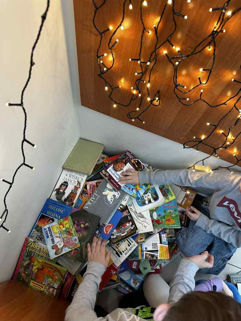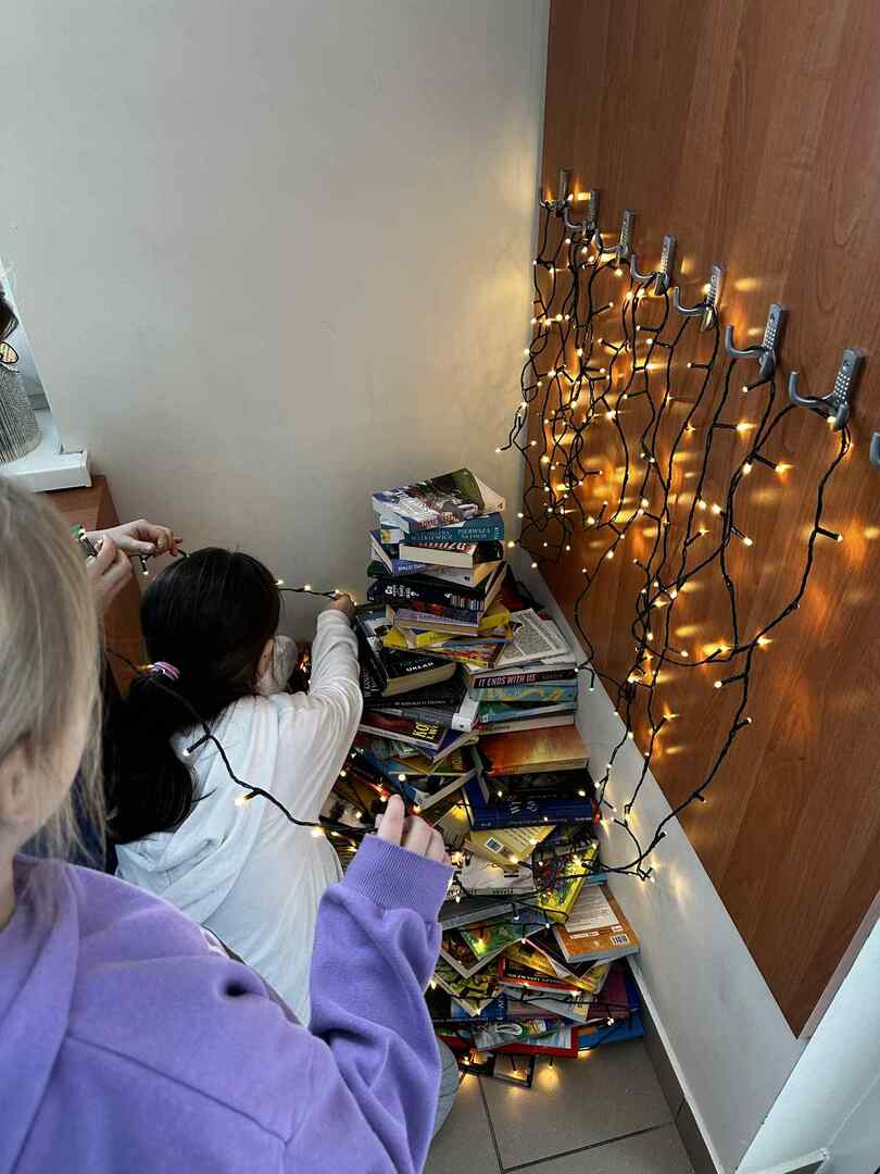 Z wielkim zaangażowaniem układali kolejne warstwy, wybierali kolory okładek i dbali o każdy szczegół, aby nasza książkowa choinka prezentowała się jak najpiękniej.