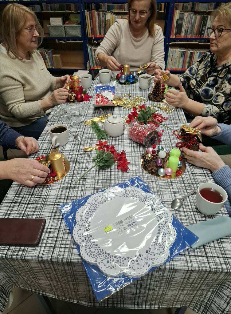 W dniu dzisiejszym odbyło się spotkanie z seniorami poświęcone warsztatom bożonarodzeniowym. Uczestnicy wykonywali własnoręczne ozdoby choinkowe, korzystając z przygotowanych materiałów plastycznych. Zajęcia przebiegały w miłej, spokojnej atmosferze, a seniorzy wykazali duże zaangażowanie i kreatywność. Warsztaty sprzyjały integracji grupy oraz wprowadziły uczestników w świąteczny nastrój.